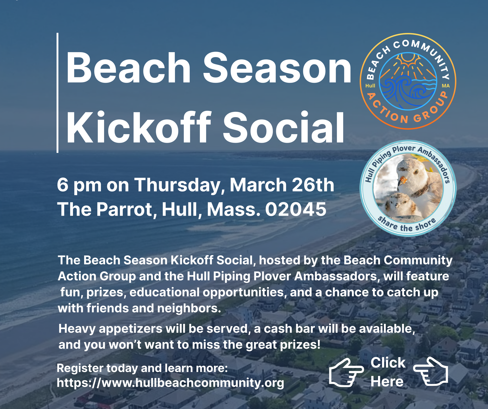 Join us to kick off the season and learn more about how you can do your part to keep North Nantasket Beach safe, clean, and enjoyable for residents and guests. Also hear from the Hull Piping Plover Ambassadors about these special shorebirds who share the beach with us.